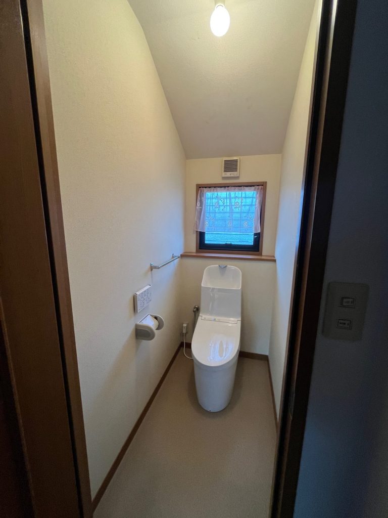 傷んだ腰壁を部分補修し、古い手洗器は撤去。K様ご希望の「配管が露出して見えるカウンタータイプの造作手洗器」を新設しました。 トイレ本体には「LIXIL プレアス」を採用。白を基調とした壁のアーチ部分にブルーのバラ柄クロスを貼り、無垢材だった床はお掃除しやすい木目柄のクッションフロアに変更することで、空間全体に美しく調和させています。